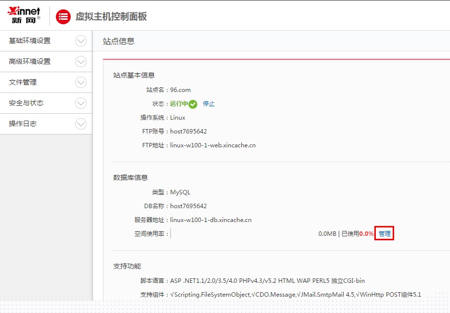 1、 當您進入虛擬主機控制面板,點擊“管理”,可以登錄至phpMyAdmin的首頁,在此頁面中您可以對您的數據庫進行管理。