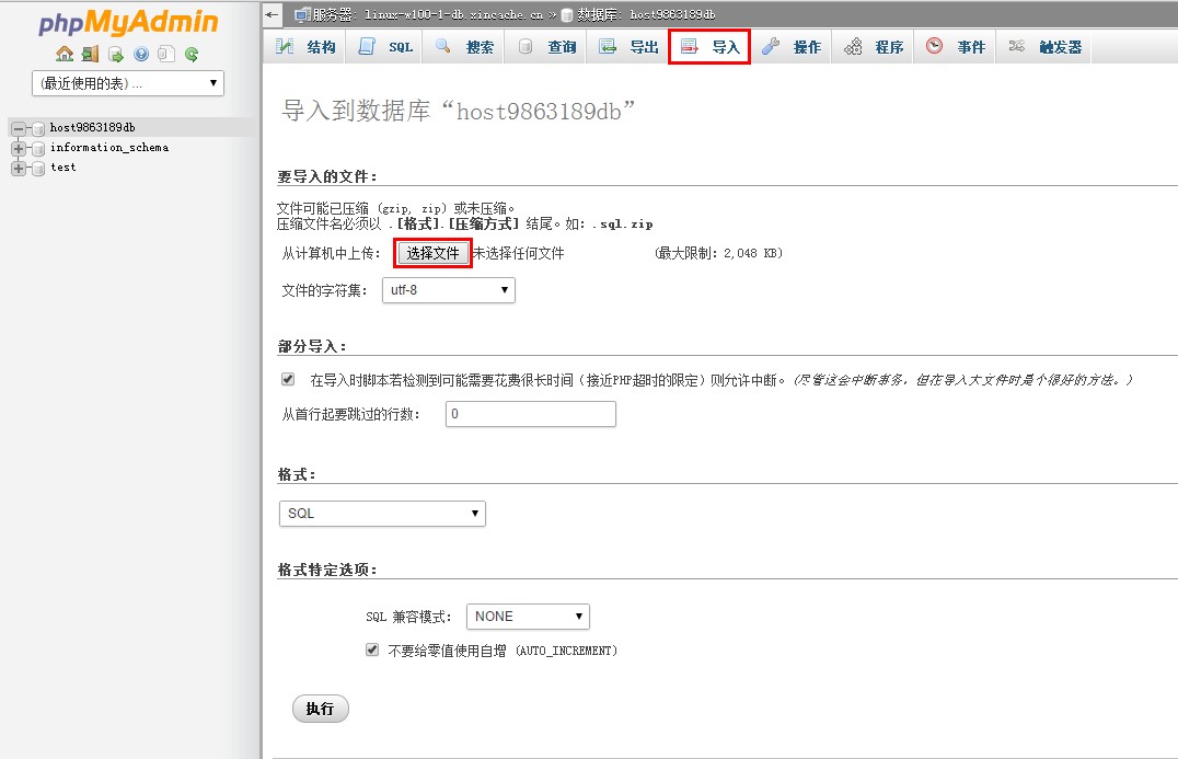 2、 數據庫“導入”功能,即數據庫還原功能。當您購買完主機后或者更換主機后,您需要從本地上傳您的MySQL數據庫信息到數據庫服務器上,此時您可以使用此功能。